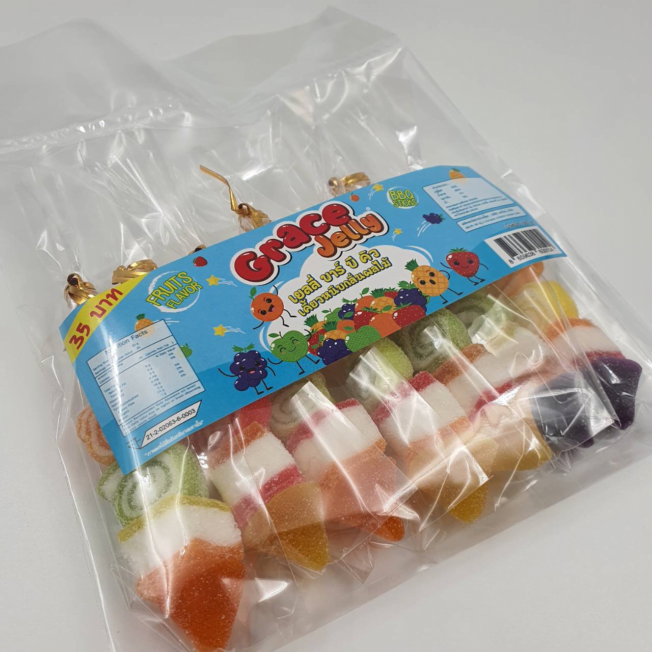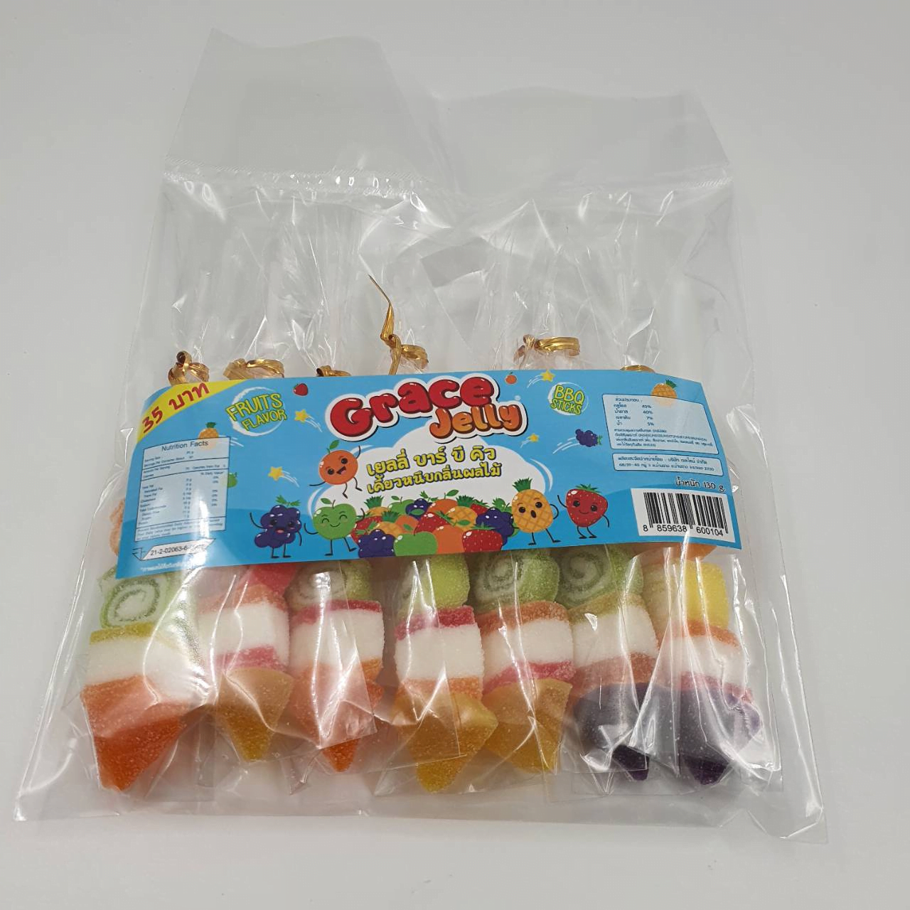 เยลลี่เสียบไม้ BBQ Sticks มีความต้องการของตลาดสูงมาก และเป็นสินค้าในกลุ่ม Niche Product หรือสินค้าที่มีความพิเศษเฉพาะเจาะจง โดยการนำขนมเยลลี่ในแต่ละรูปแบบ เช่น ปีรามิด แซนวิชเต๋าเล็ก แซนวิชเต๋าใหญ่ ม้วนก้นหอยโรล หัวใจ และอื่นๆ นำมาเสียบด้วยหลอดพลาสติกหรือก้านอมยิ้มเกรดอาหาร (food grade) มีความปลอดภัย ไม่ขึ้นเชื้อราเหมือนใช้ไม้เสียบลูกชิ้น จากนั้นนำมาใส่ถุงพลาสติกและผูกลวดสีทอง